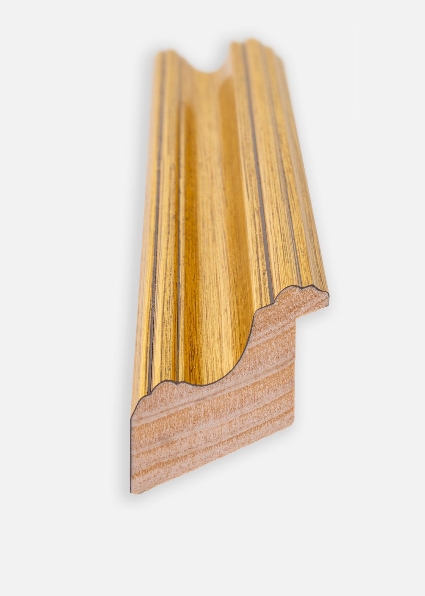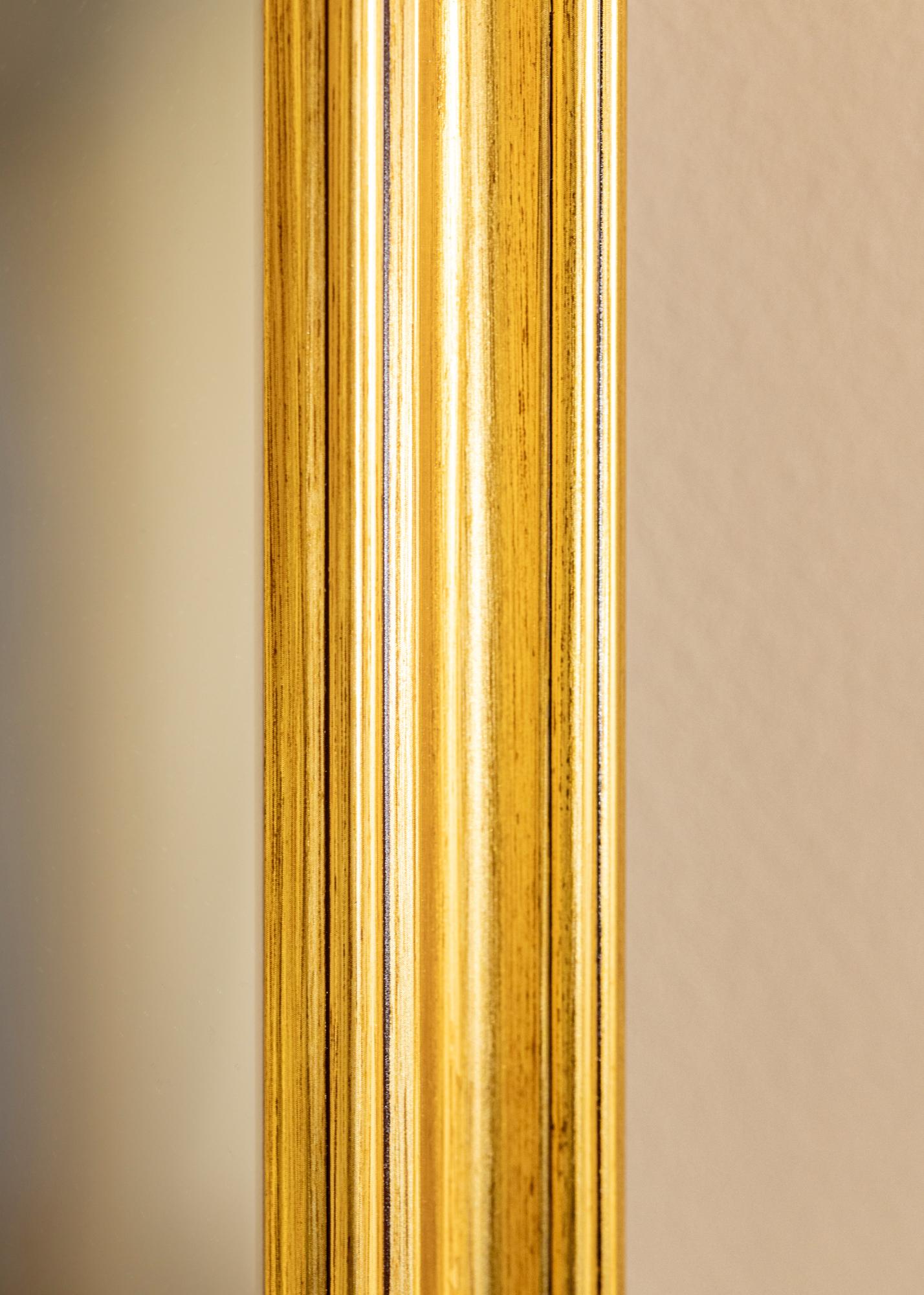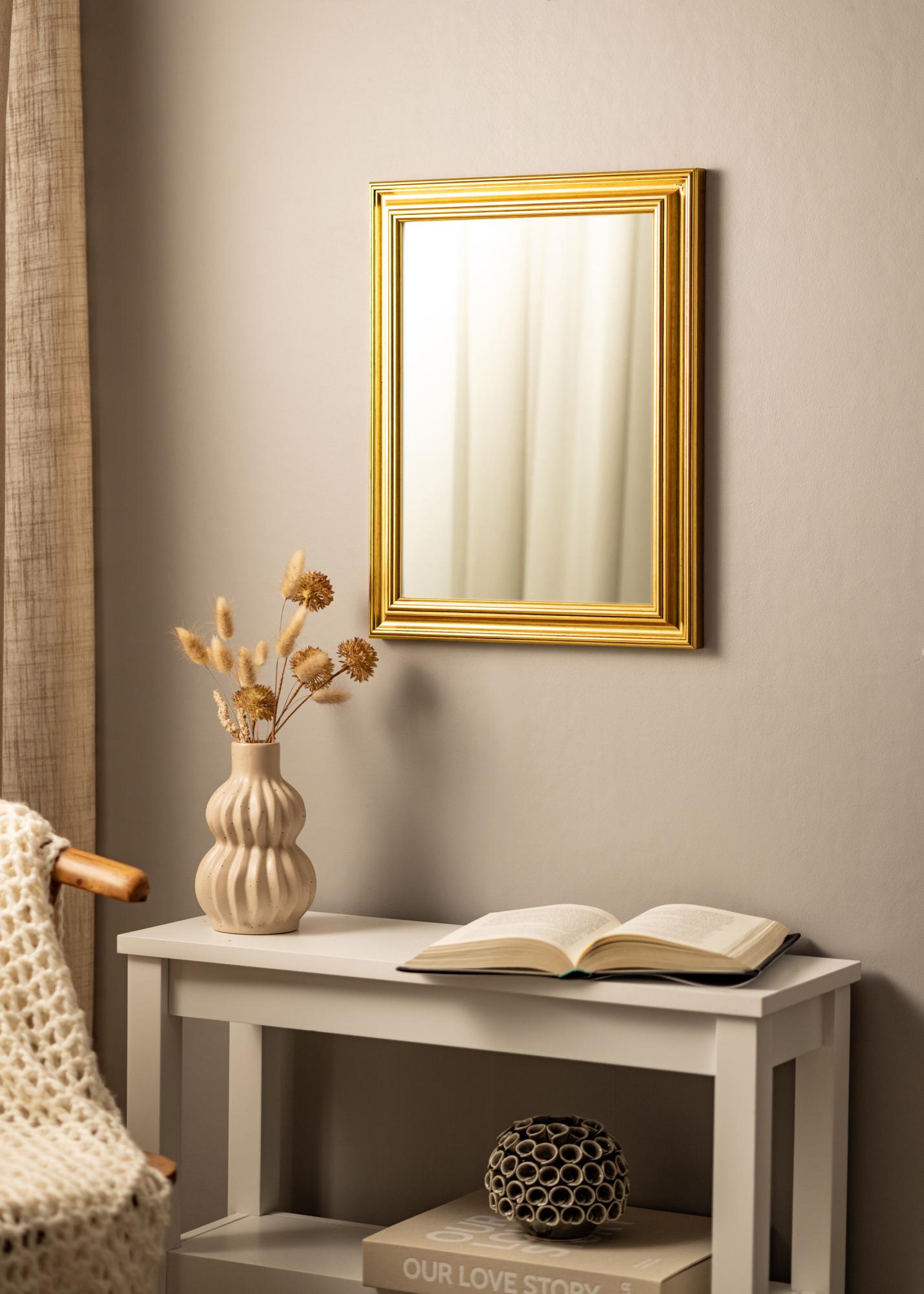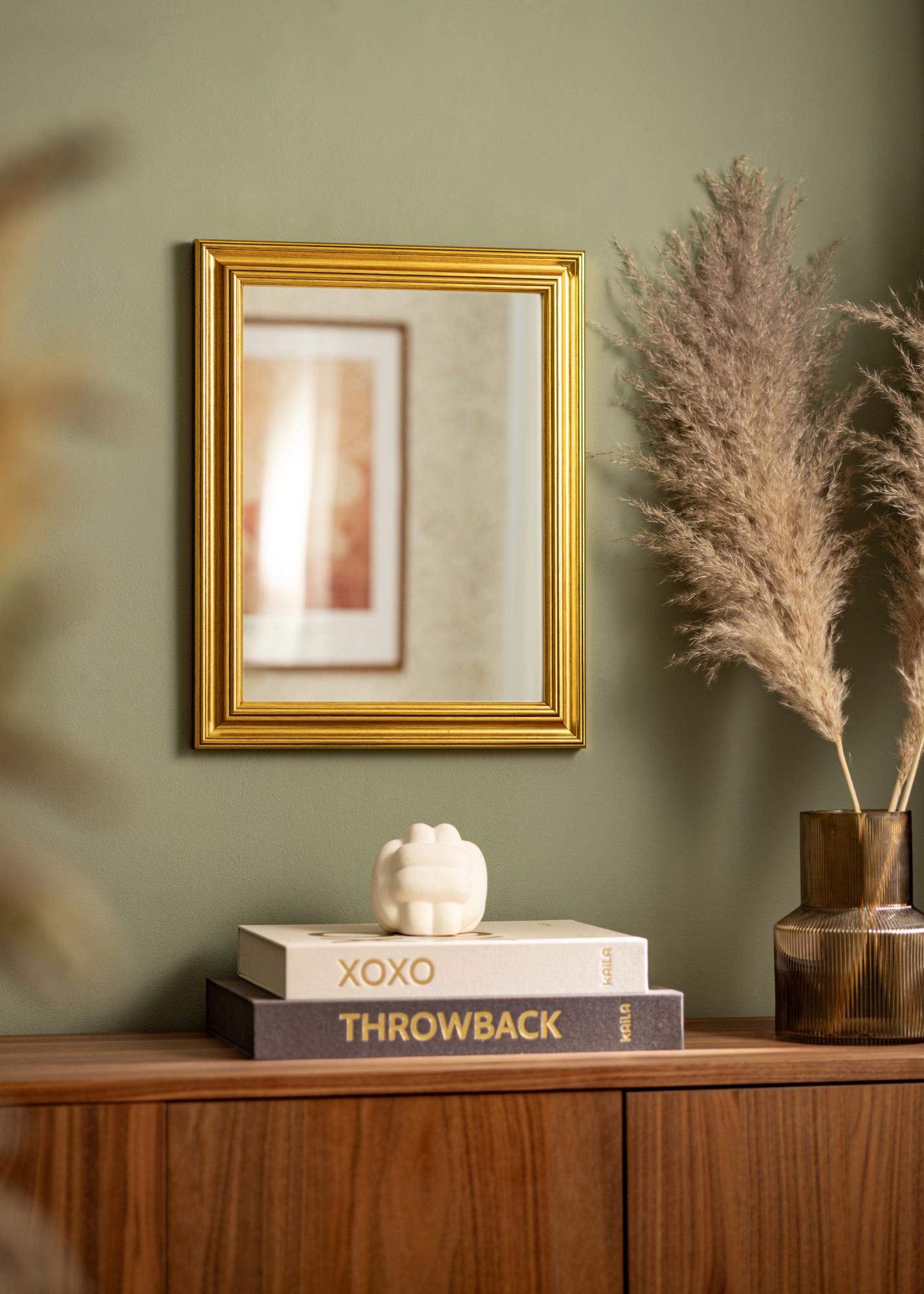 Klasický profilovaný zrcadlo ve zlaté barvě s rámem ze dřeva, který působí ručně malovaným dojmem, což zrcadlu dodává živý vzhled a jemný lesk. Široká lišta rámu dodává zrcadlu exkluzivní vzhled a činí, že zrcadlo se hodí jak do domu zařízeného starožitnými předměty, tak i do moderního domu s romantickým nebo elegantním interiérem. Zkuste zrcadlo zkombinovat s několika mosaznými svícny a obrazy ve zlatých rámech, abyste vytvořili harmonický pocit v místnosti.