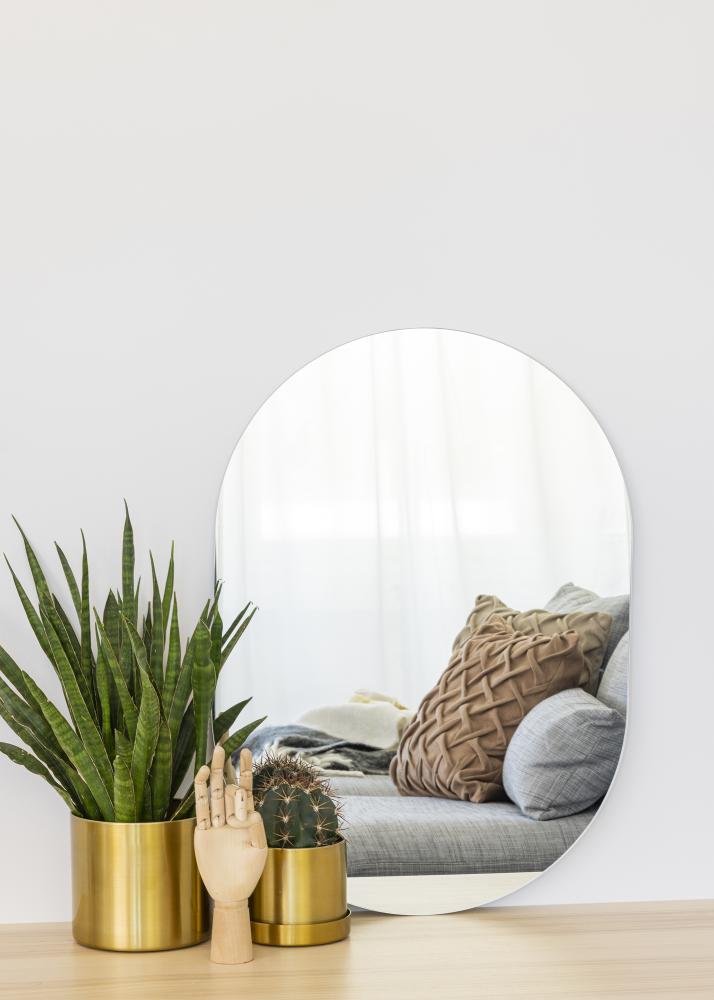 Zrcadlo bez okraje s oválným tvarem. Perfektní dekorativní prvek do obývacího pokoje nebo jako menší zrcadlo do haly.