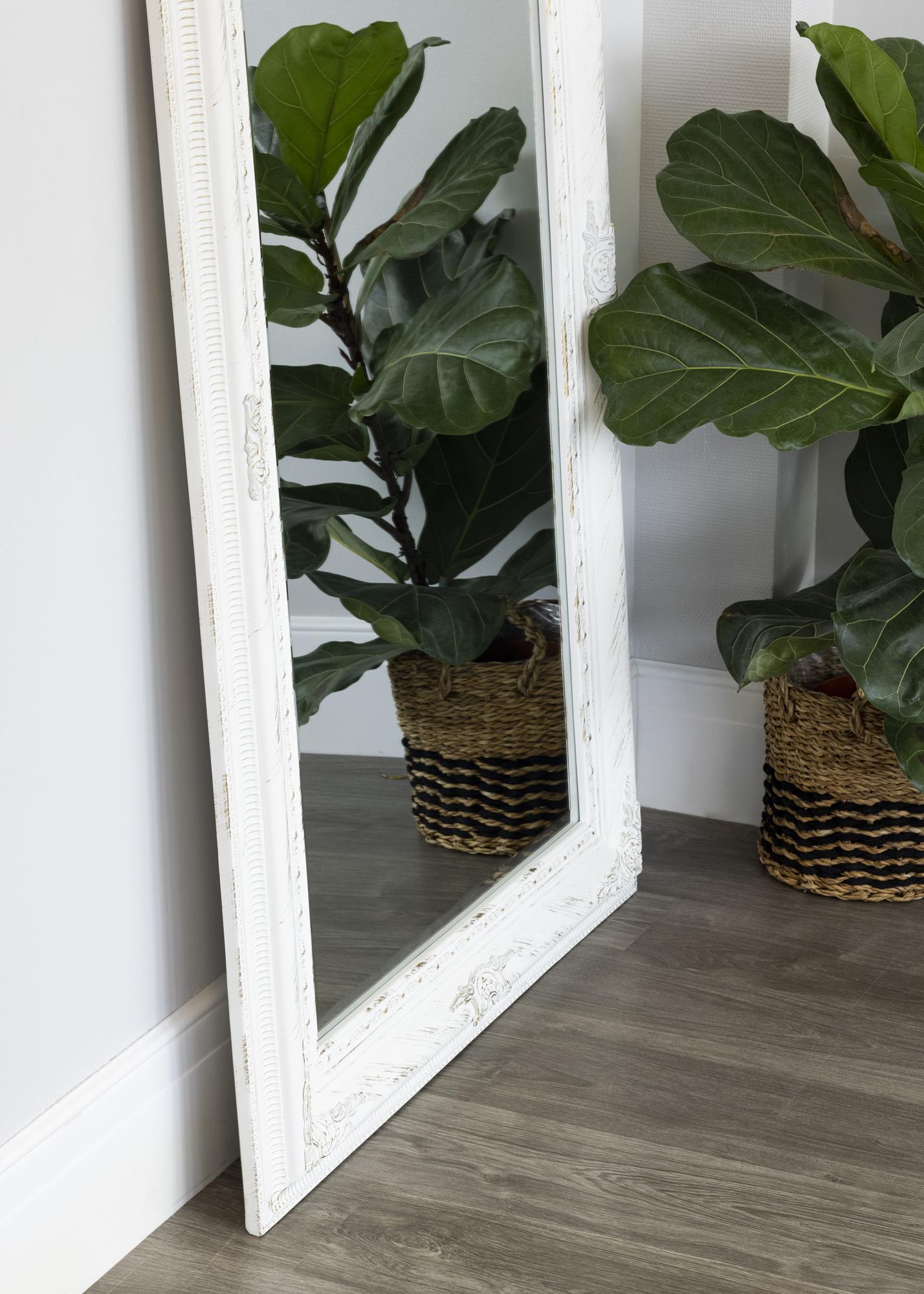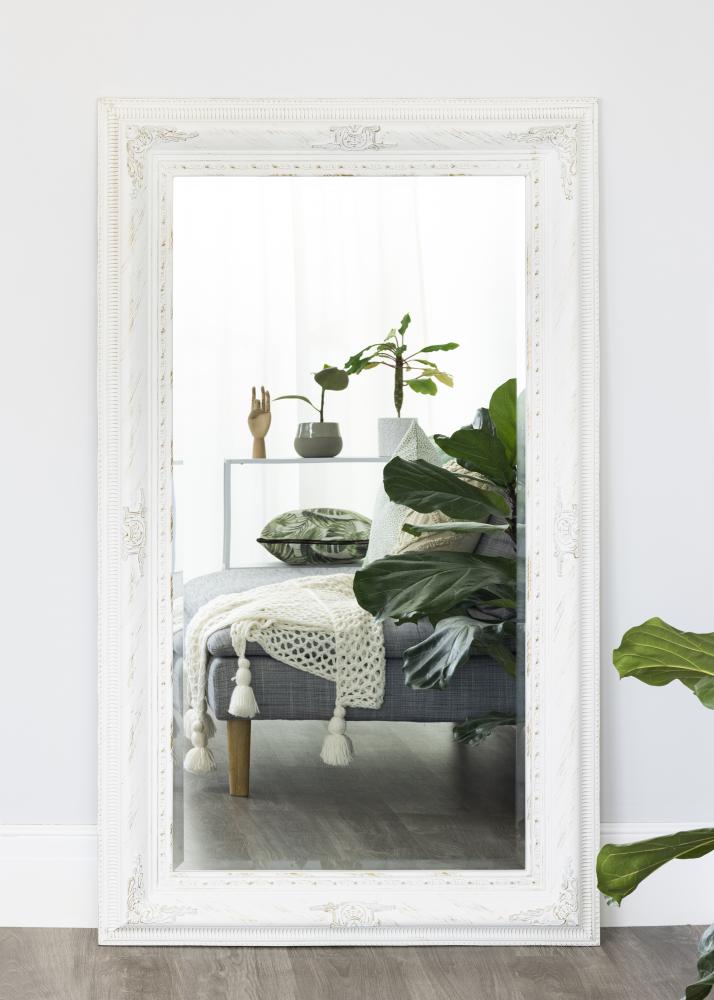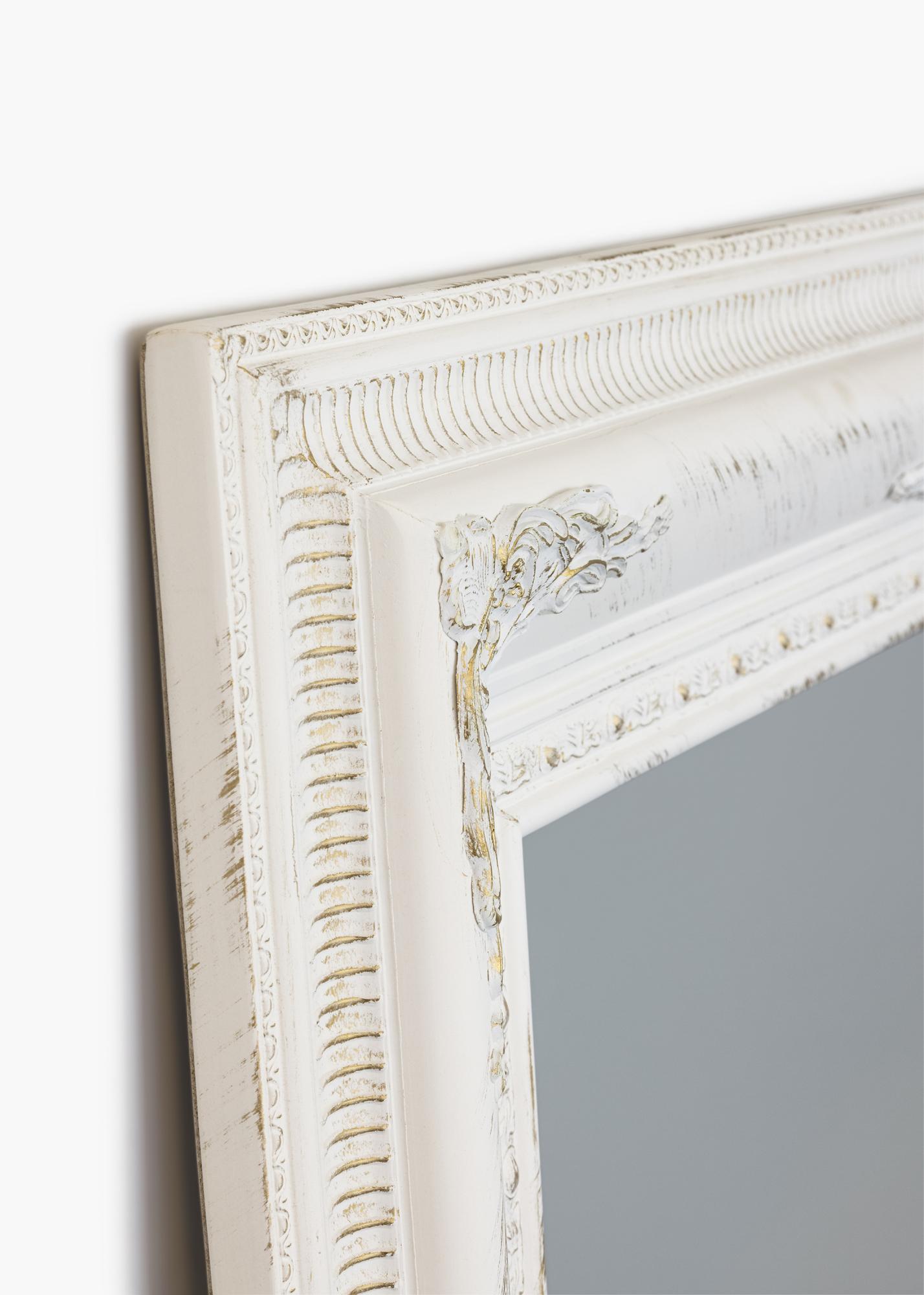 Zrcadlo v bílé barvě s romantickým nádechem, ideální pro ty, kteří chtějí vytvořit interiér vyzařující růže, glamour a dávné časy. Zrcadlo je hezké na zavěšení jak v koupelně nad větším nábytkem, tak i v ostatních částech domova, jeho velikost umožňuje dobré umístění na stěnu nad robustní kredenc nebo pohovku. Zrcadlo může být také součástí nástěnné galerie s obrazy zarámovanými bílými rámy v podobném stylu a pomáhá prosvětlit tmavou místnost, pokud je zavěšeno naproti oknu.