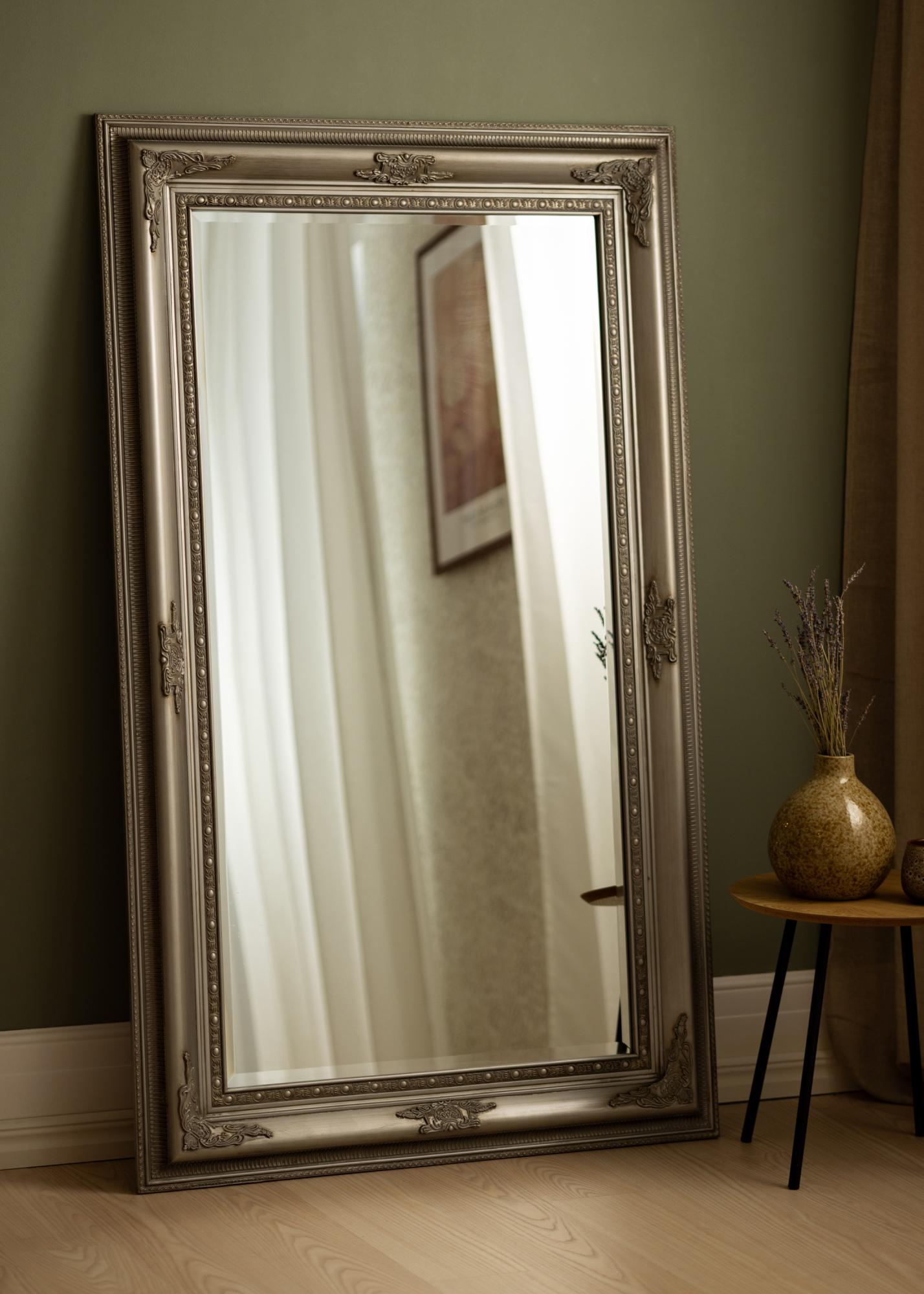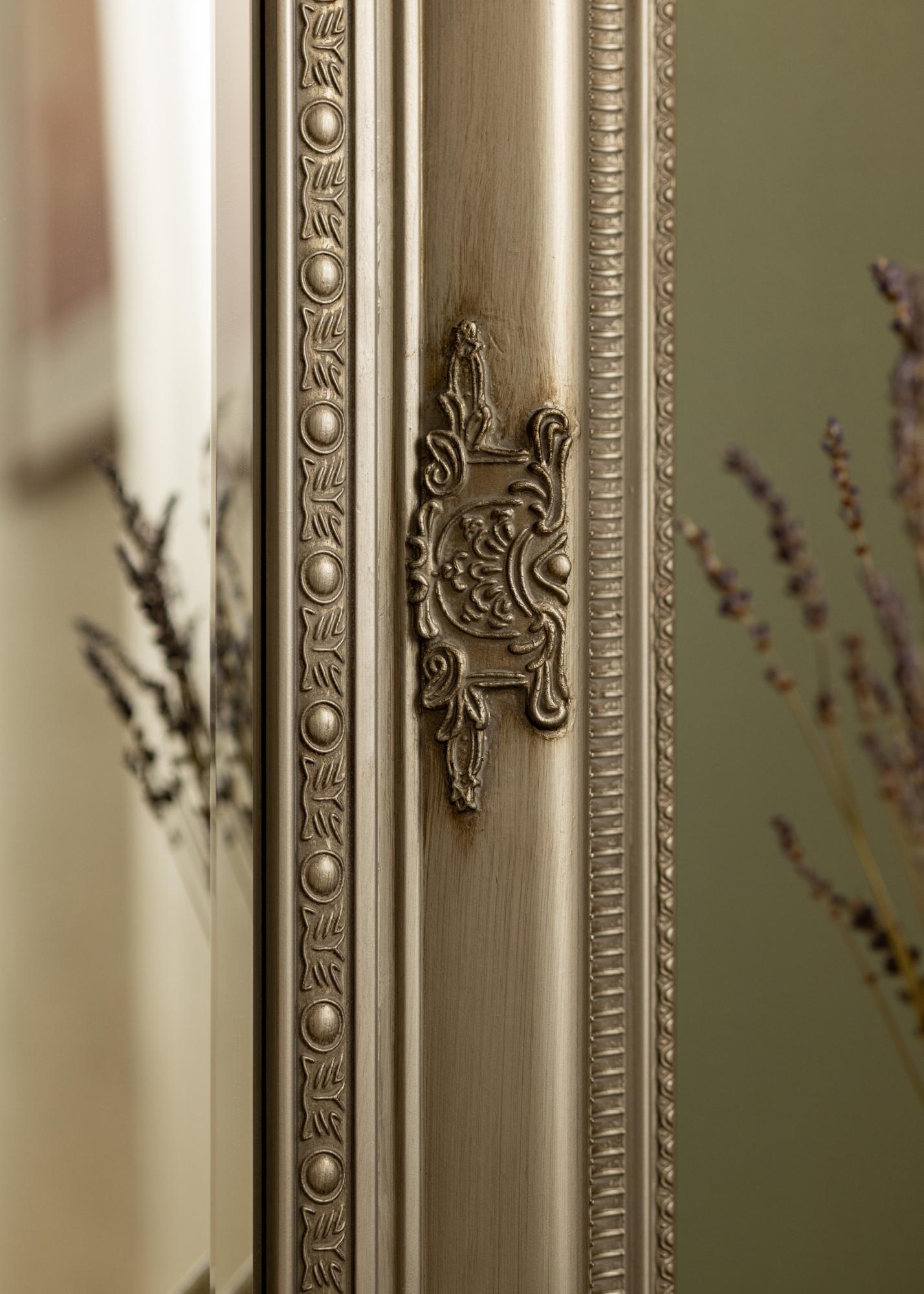 Stříbrné zrcadlo v klasickém stylu s profilovaným vzorem a květinovými ornamenty po celém okraji. Antický vzhled zrcadla zajišťuje, že se krásně hodí k interiéru s klasickým nábytkem, ale také vytváří zajímavý kontrast v moderním minimalistickém prostředí. Díky svému formátu je zrcadlo ideální jak do předsíně, tak do velké šatny nebo na zeď v ložnici, kde oblečení hraje důležitou roli v dekoru. Zvýrazněte zrcadlo dekorativními doplňky ve stříbrné barvě v místnosti.