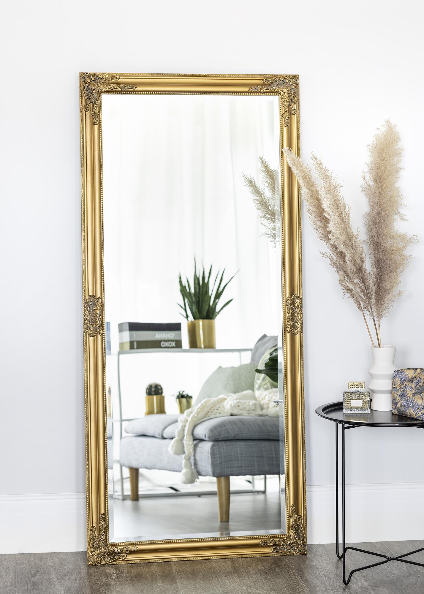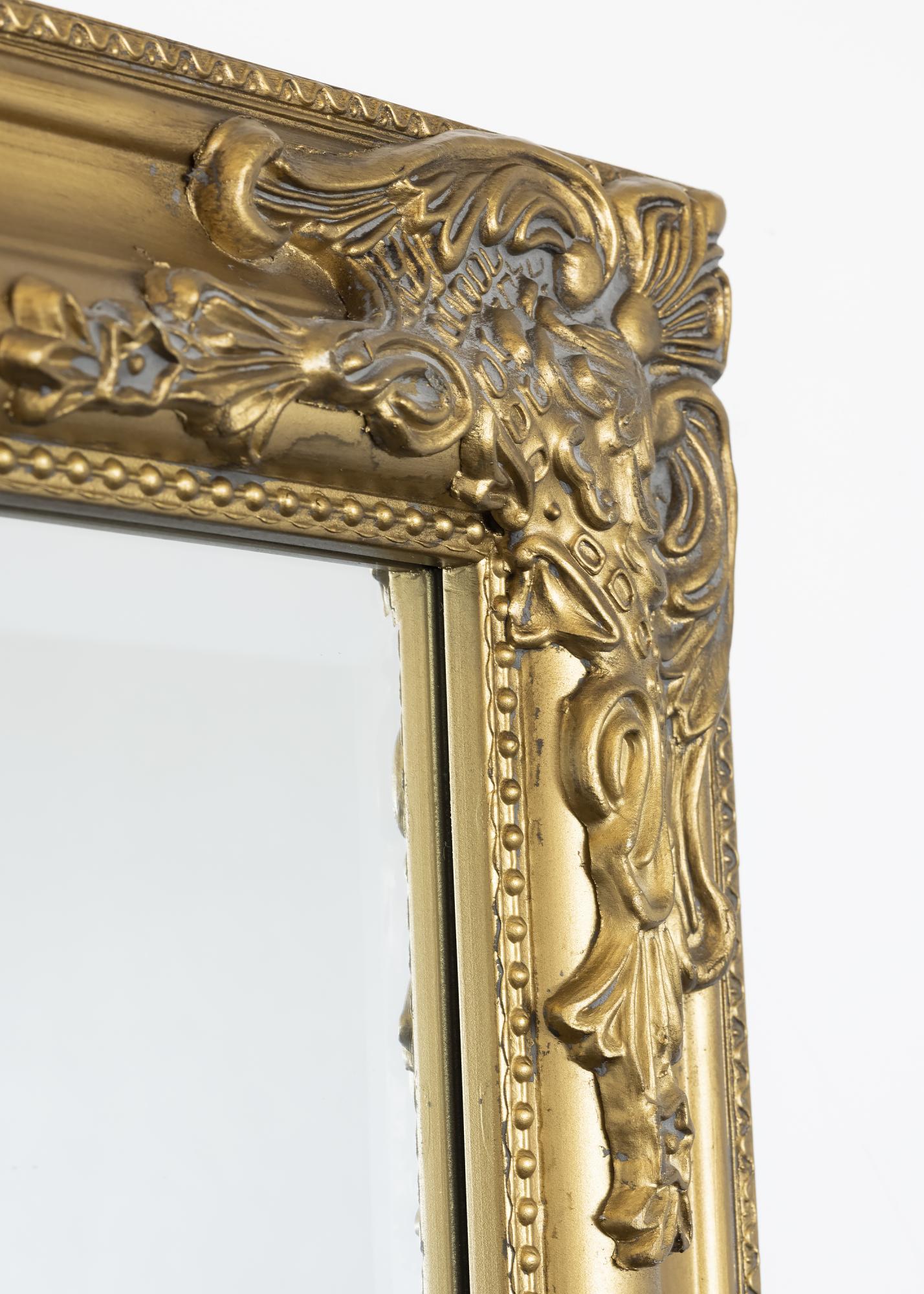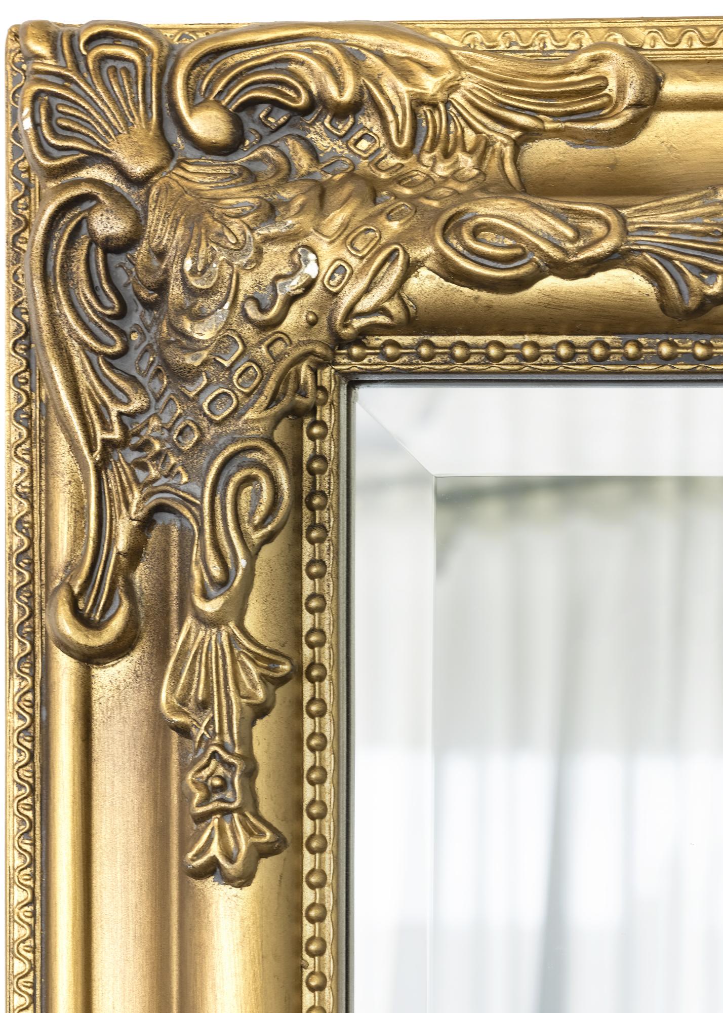 Zrcadlo s jemným profilem ve zlaté barvě s antickým nádechem, zdobené květinovými ornamenty. Klasický styl rámu zrcadla umožňuje jeho začlenění do interiérových stylů se starším nábytkem, ale lze jej také použít k vytvoření zajímavého kontrastu v elegantním moderním interiéru. Zrcadlo bude vypadat skvěle zavěšené v předsíni, ložnici nebo v šatně a pěkně vynikne spolu s interiérovými doplňky z mosazi nebo ve zlatých odstínech.