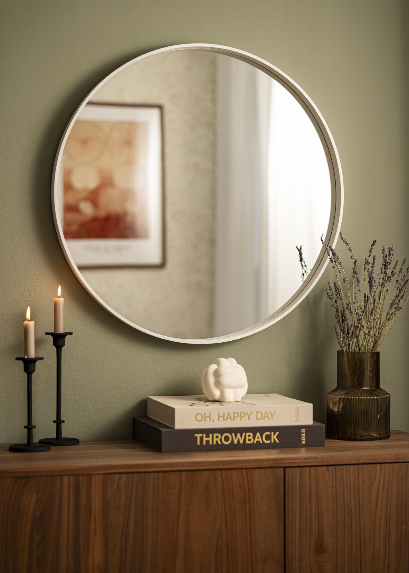 Objevte elegantní jednoduchost našeho kulatého zrcadla, nadčasového dekoračního prvku, který dokonale zapadne do každého domova. Bílý rám kolem zrcadla dodává světlý a čistý dotek, který doplňuje všechny barvy a styly ve vašem pokoji. Jeho minimalistický design umožňuje, aby splynulo, zatímco zůstává výrazným akcentem na zdi.