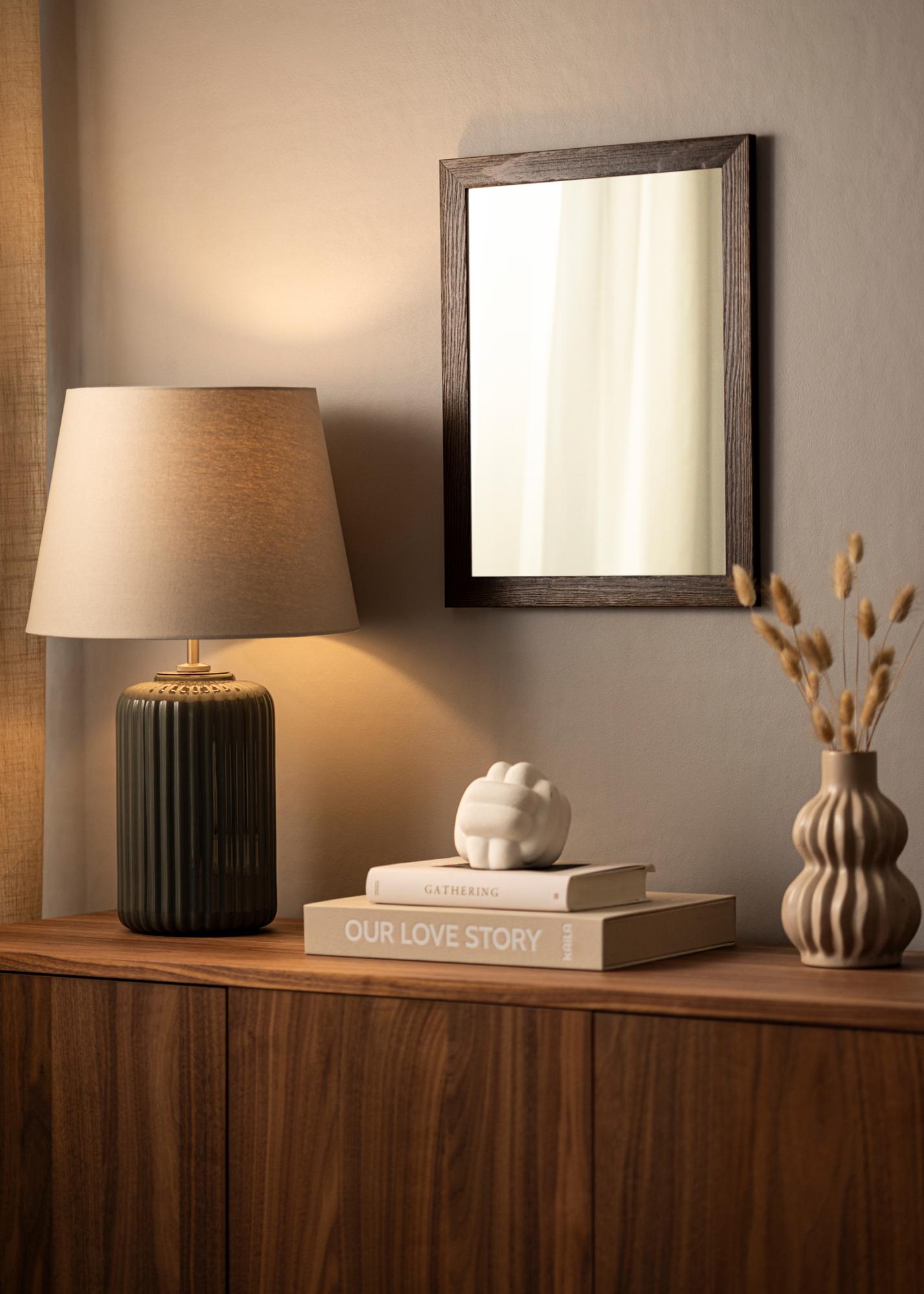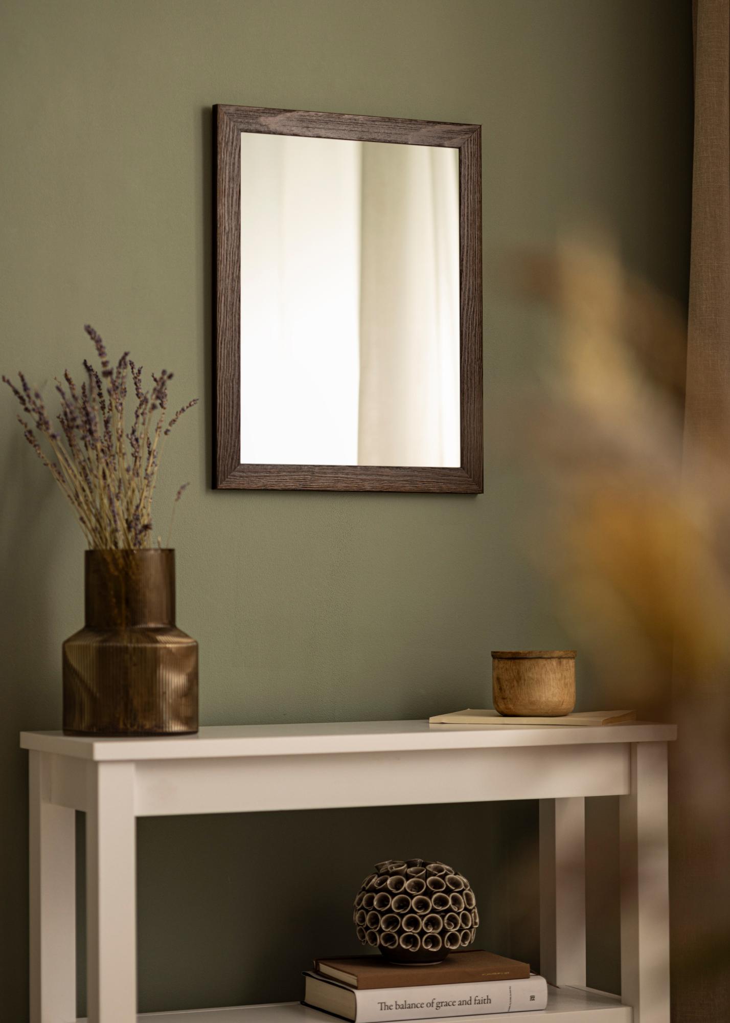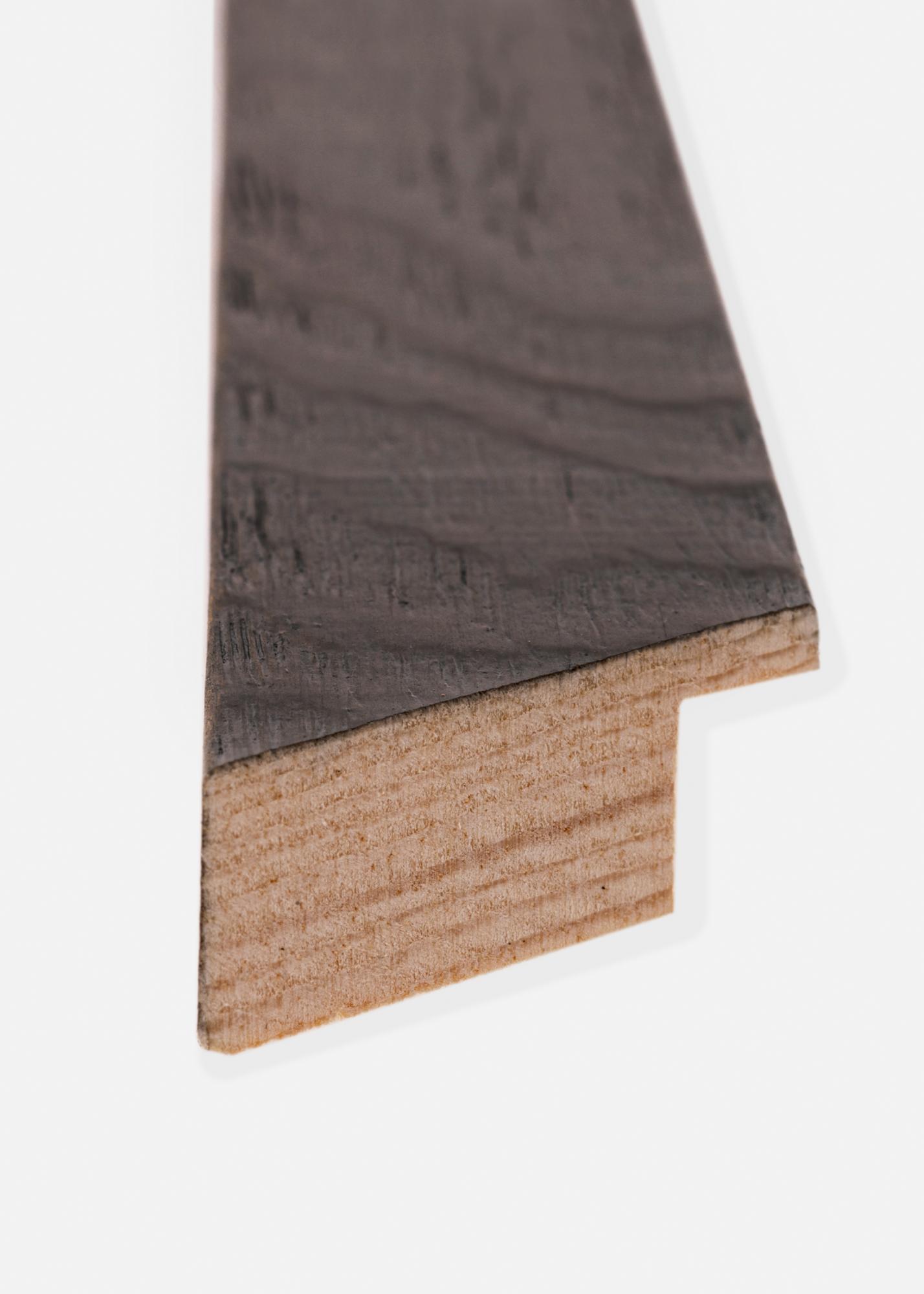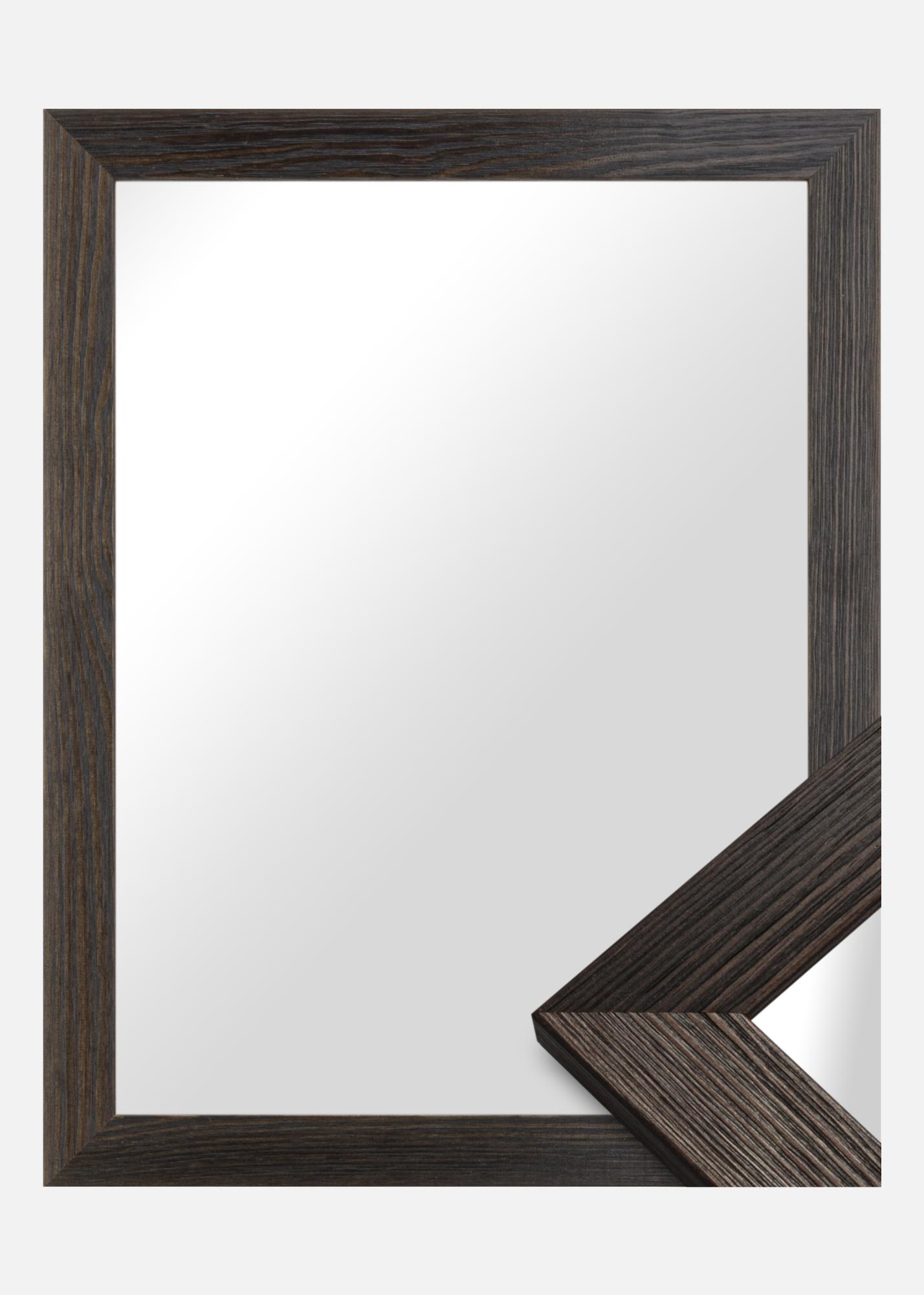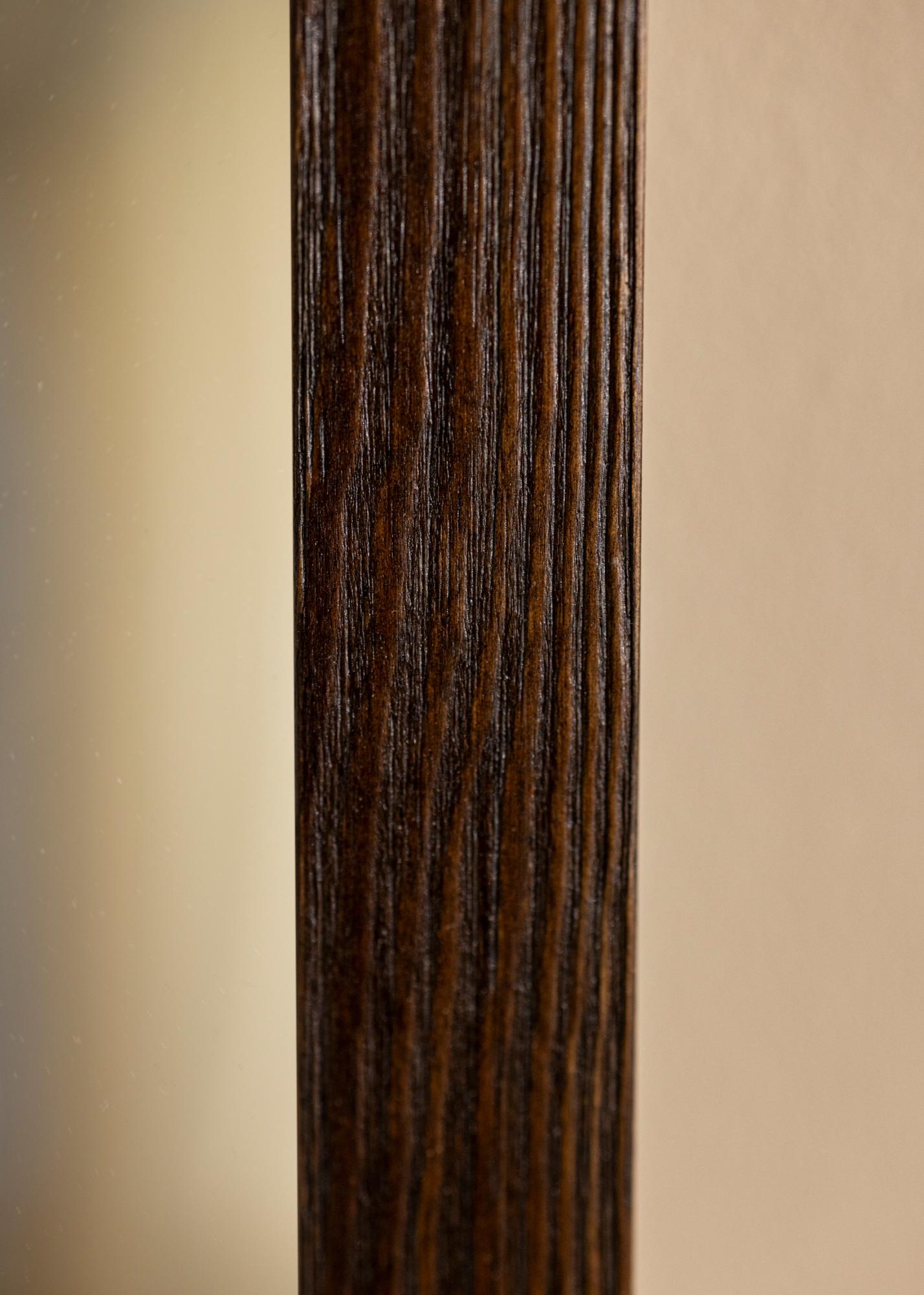 Robustní hnědý rám zrcadla s viditelnými dřevěnými žilkami se širokým profilem. Hodí se, když hledáte tmavý dřevěný rám s přirozeným vzhledem.