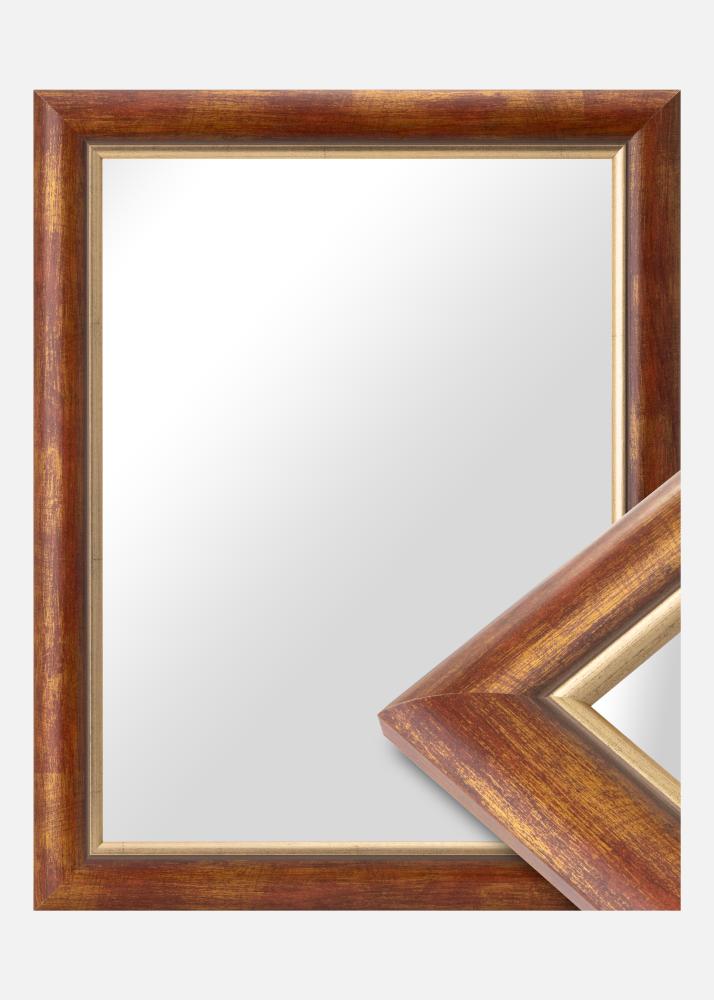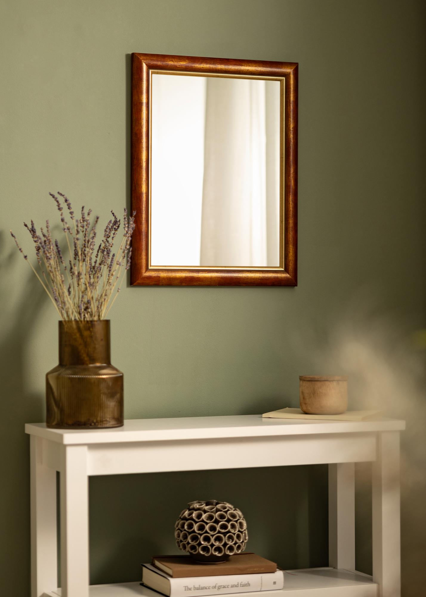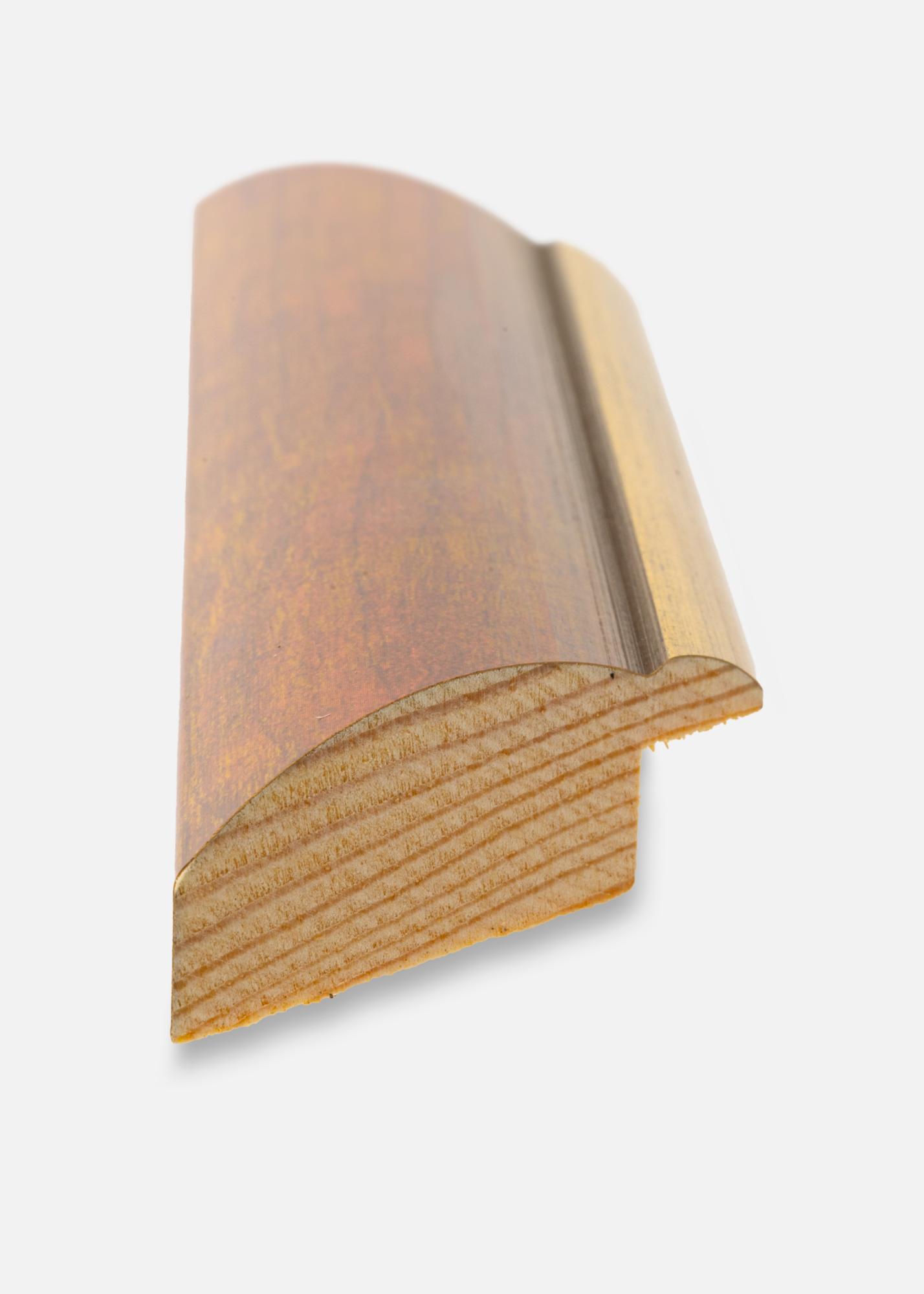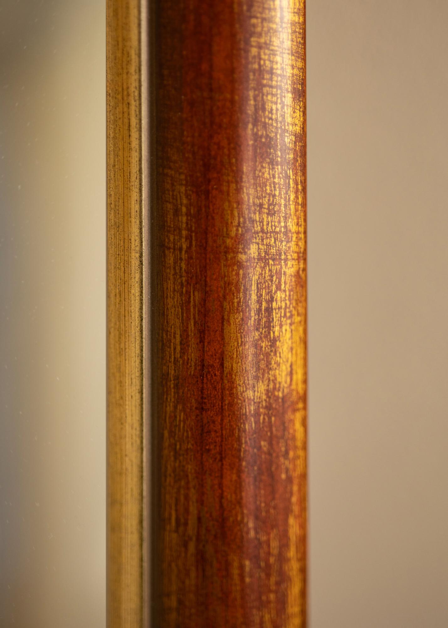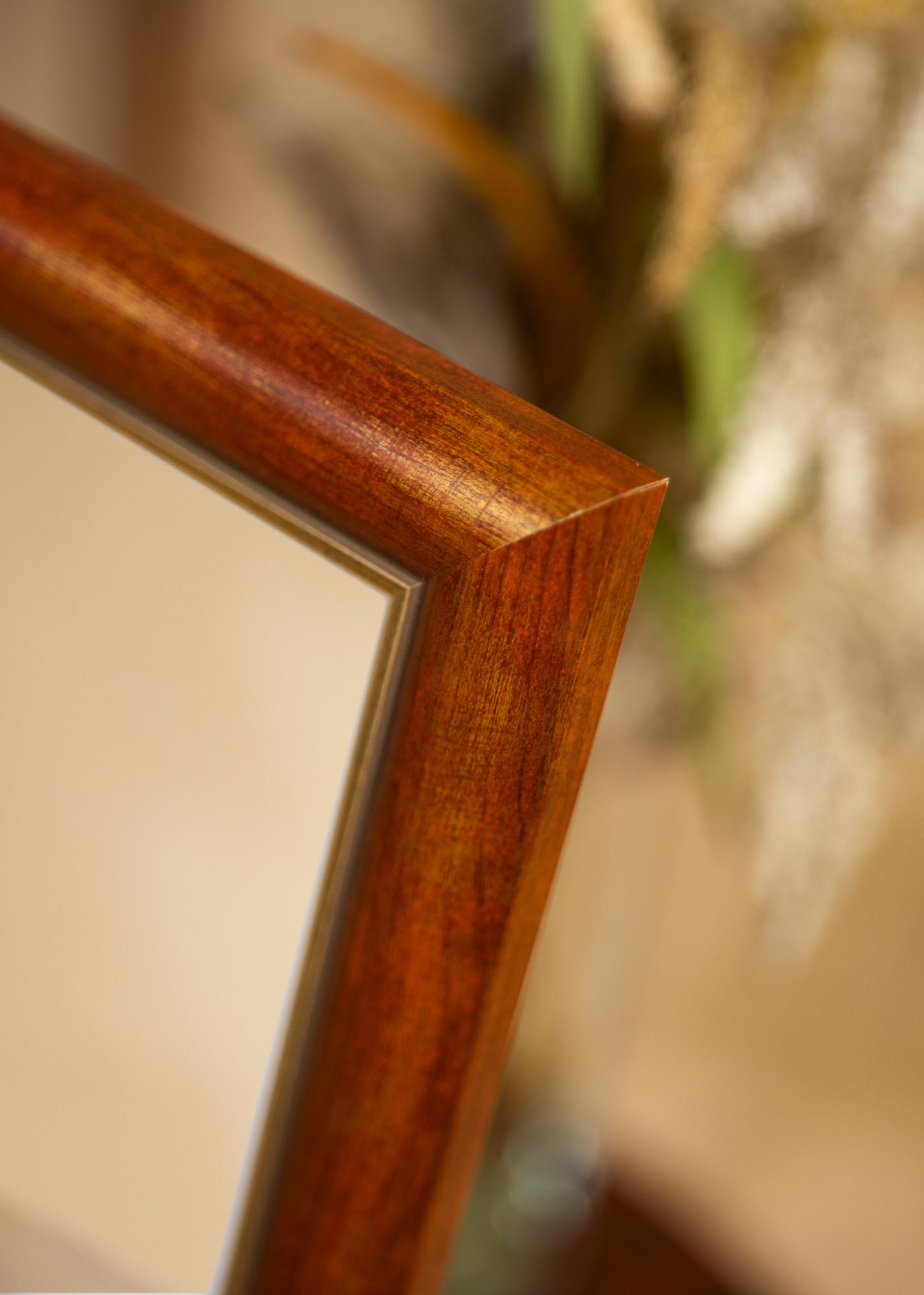 Nadčasová dřevěná lišta vyrobená ve Finsku s elegantním červeně tónovaným povrchem dřeva se zlatým okrajem nejbližším ke sklu zrcadla. Rám má široký profil o šířce 41 mm a hloubku 19 mm, což dodává zrcadlu extra hloubku.