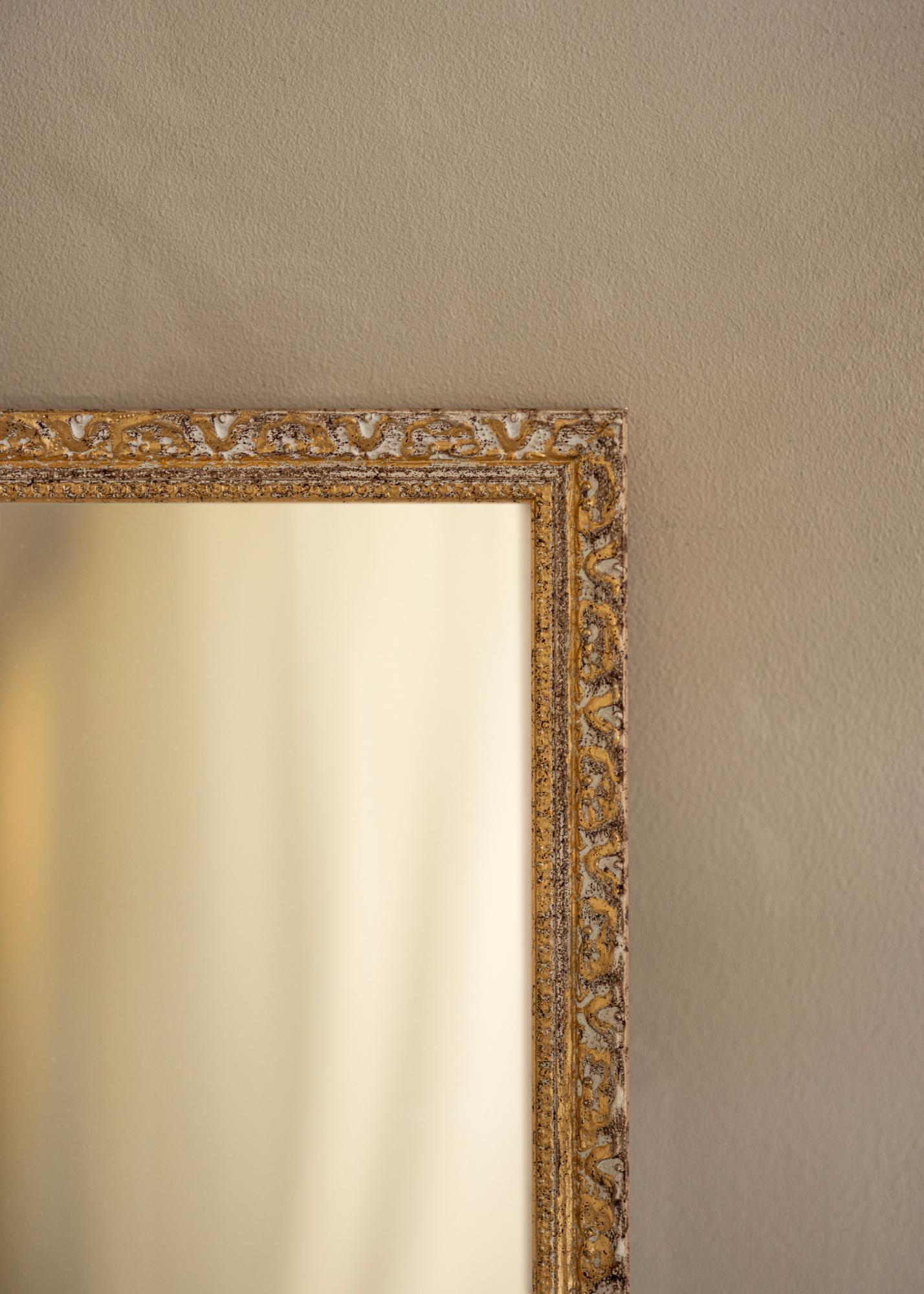 Stylový retroinspirativní zrcadlový rám ve vysoké kvalitě s exkluzivním designem ve stříbrné a zlaté barvě, který je vyroben v Itálii.