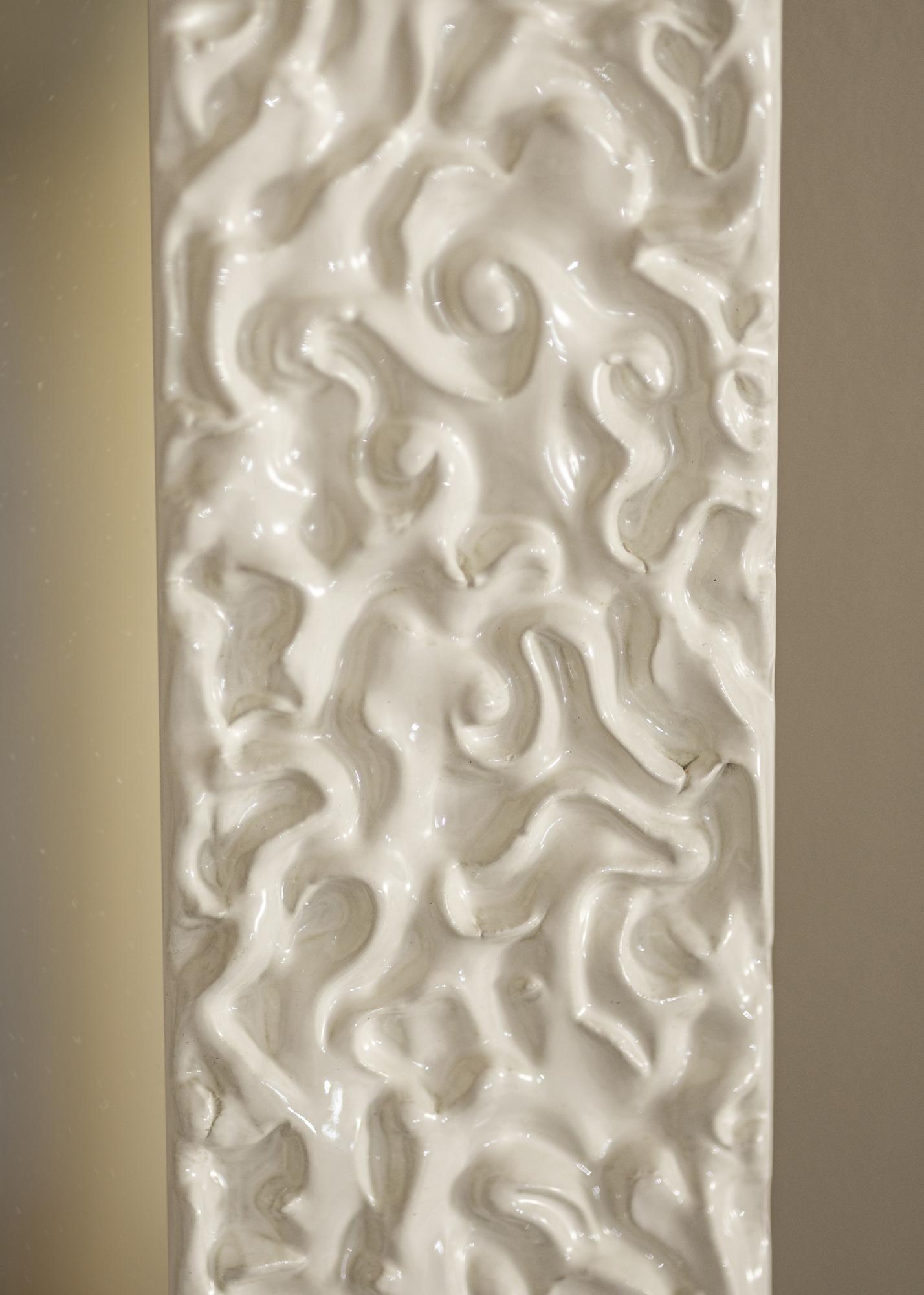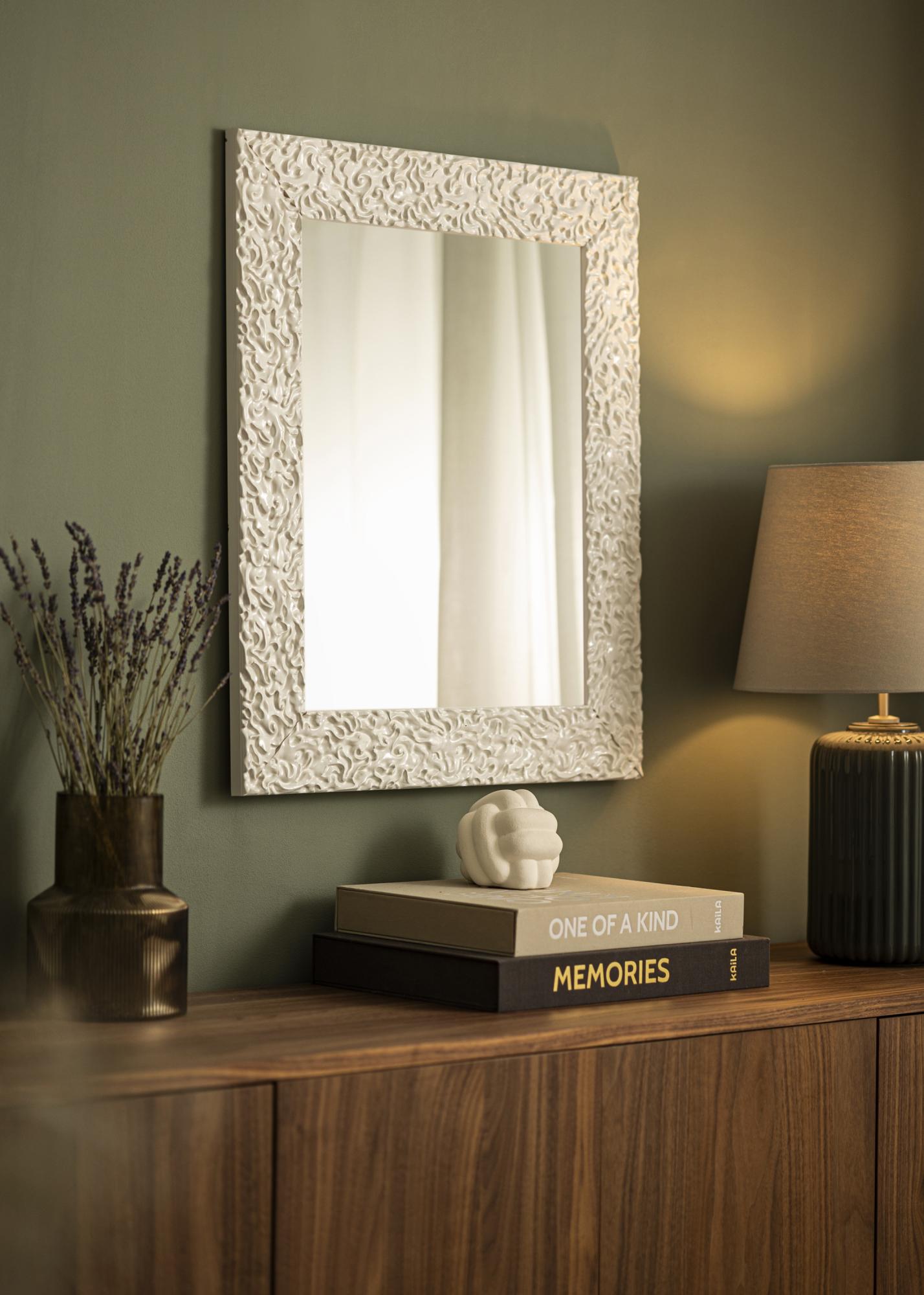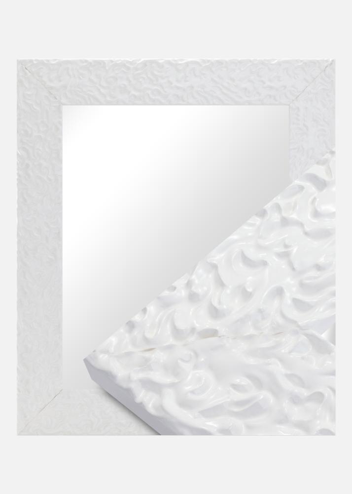 Vysoce lesklý bílý povrch zrcadla má živý, organický vzor, který vytváří moderní a elegantní pocit. Tento lesklý povrch zdůrazňuje měkké, plynulé tvary a dává rámu exkluzivní výraz. Je to dokonalé řešení pro ty, kteří hledají poutavý detail, který kombinuje klasickou inspiraci s moderním designem.