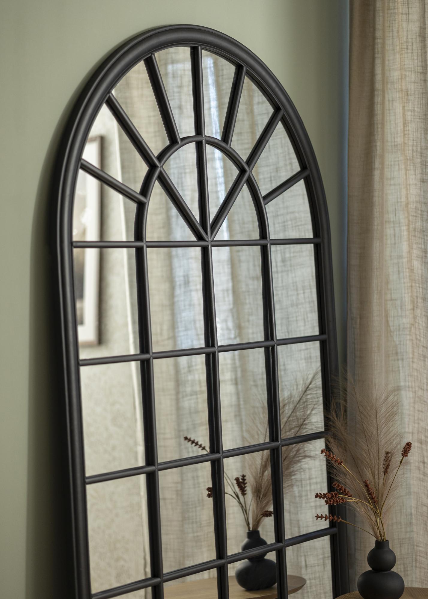 Objevte majestátní přítomnost našeho jedinečného zrcadla, skutečného lákadla pro každou místnost. S jeho velkorysými rozměry 103x180 cm nabízí toto zrcadlo nejen praktickou funkci, ale stává se také součástí vašeho interiéru. Jeho působivý polokruhový obloukový tvar nahoře je doplněn uchvatnou mřížkovou strukturou připomínající okno, která zrcadlu dodává výraznou industriální estetiku.
