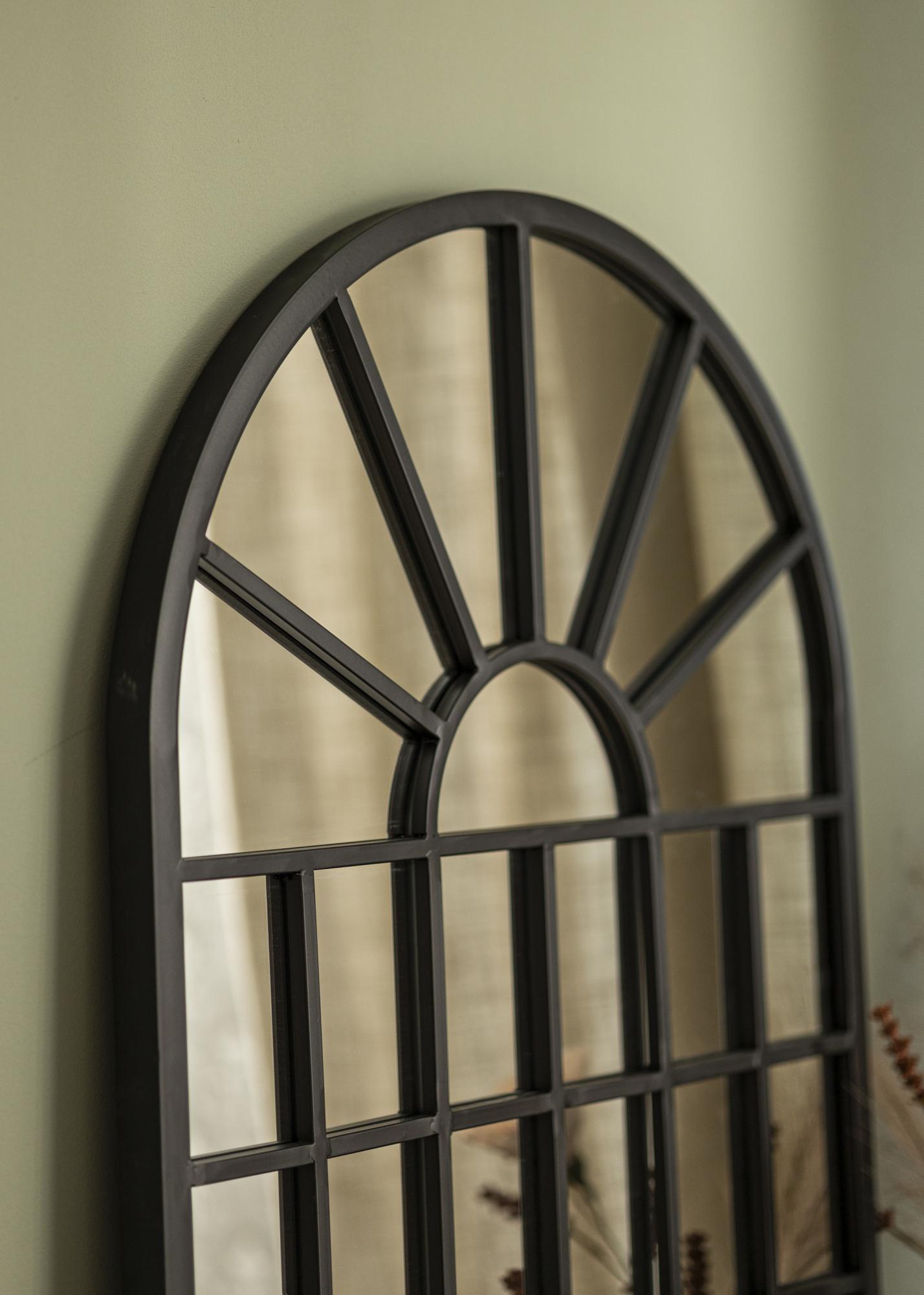 Černý kovový rám dává zrcadlu výrazný a moderní pocit, zatímco obloukový vršek přidává dotek klasické elegance. Tvar zrcadla připomíná tradiční okno, což vytváří iluzi prostoru a světla v místnosti. Průmyslový styl je doplněn kovovými proužky, které rozdělují zrcadlovou plochu, což není jen elegantní detail, ale také přispívá k jeho robustní konstrukci.