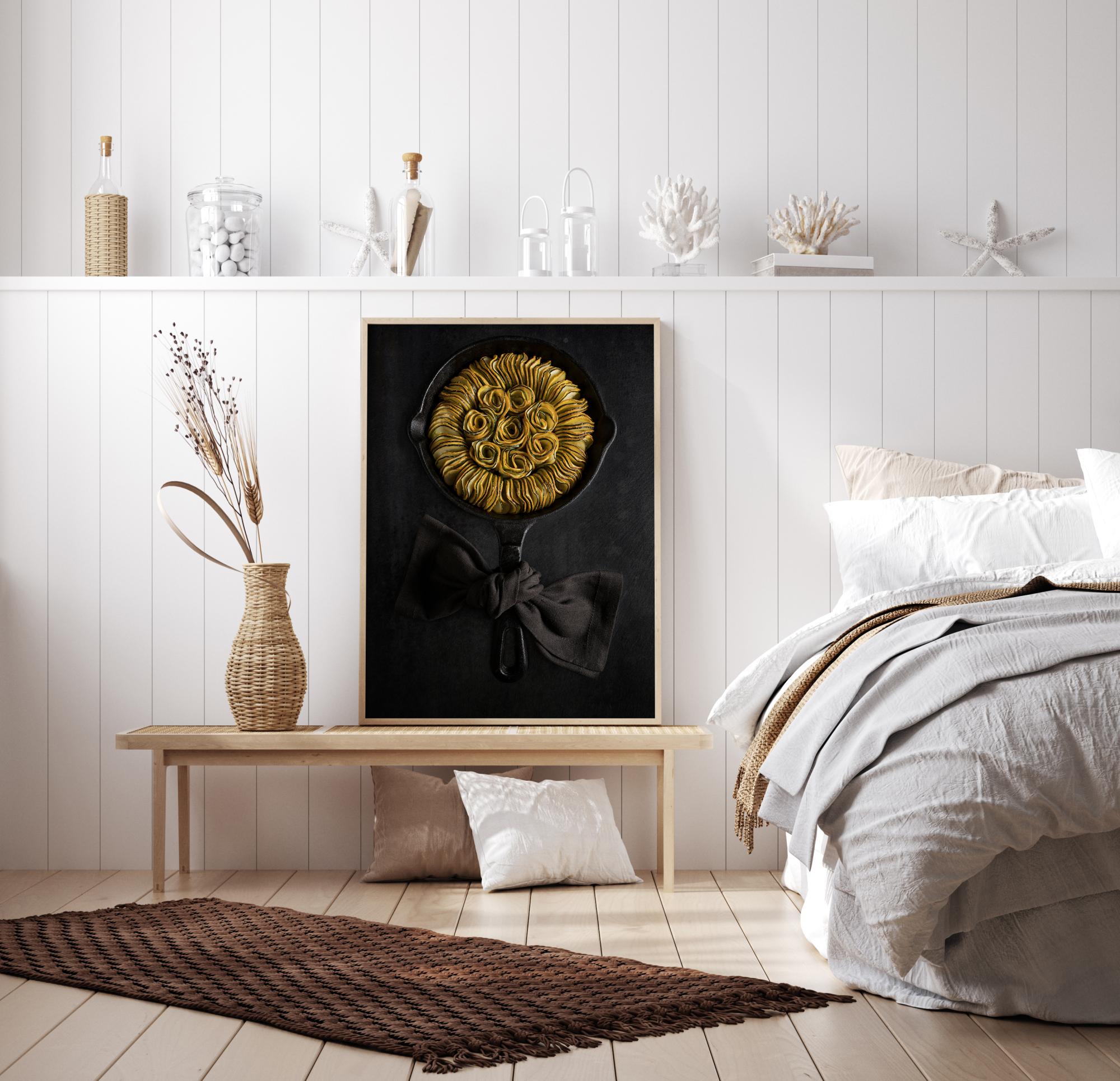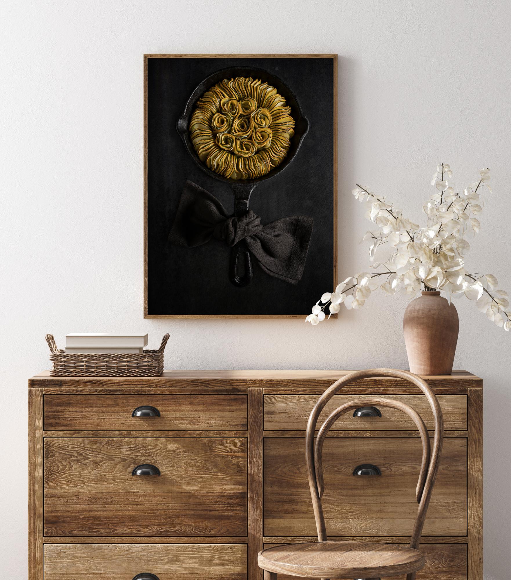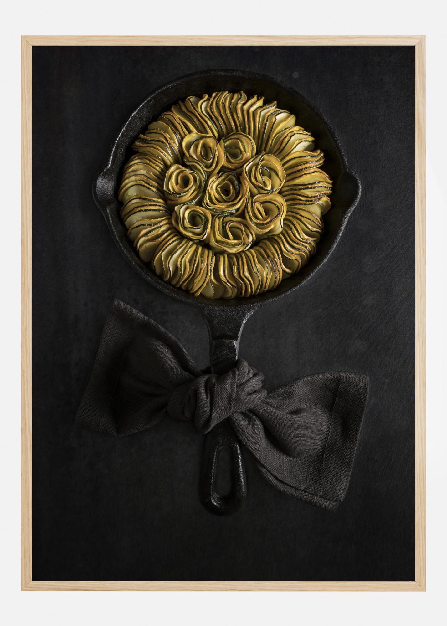 Lahodný plakát s ratatouille s cuketou nebo tykví elegantně uspořádanými v litinové pánvi, což vytváří fantastický tvar slunečnice. Žluté a zelené cukety vynikají proti černé pánvi s textilní mašlí uvázanou kolem držadla. Pověste si tohle do své kuchyně a vyzkoušejte, zda dokážete připravit toto lákavé jídlo.