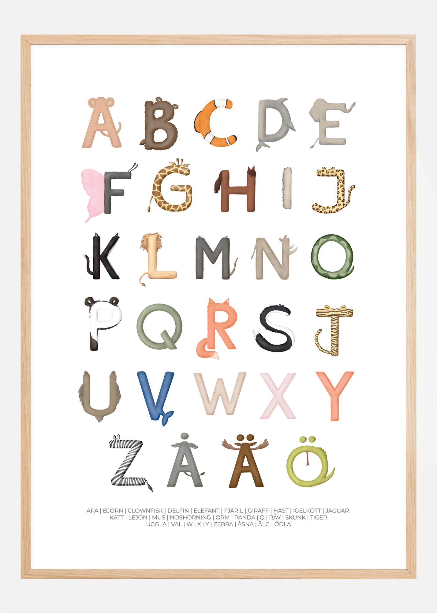 Tento hravý a vzdělávací plakát je ideální pro inspiraci zvědavosti a učení u dětí. Ukazuje abecedu reprezentovanou řadou různých zvířat, každé písmeno je unikátně tvarované tak, aby zobrazovalo zvíře, které začíná právě tím písmenem. Od 'A' jako opice po 'Ö' jako ještěrka, každá postava je bohatě ilustrovaná s jasným, přátelským a barevným stylem. Obsahuje také tři dodatečná písmena švédské abecedy: 'Å', 'Ä' a 'Ö', což poskytuje kompletní jazykový zážitek.